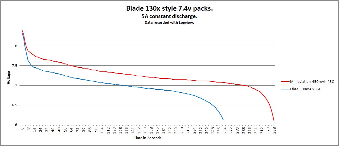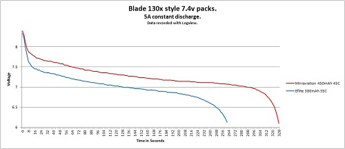 Check out the discharge graph below that compares the Miniaviation 450mAh 45C battery with the standard battery pack. We try / test many different cells, only when we are happy we have the best do we offer them for sale to you. How many other battery companies provide you with discharge graphs?